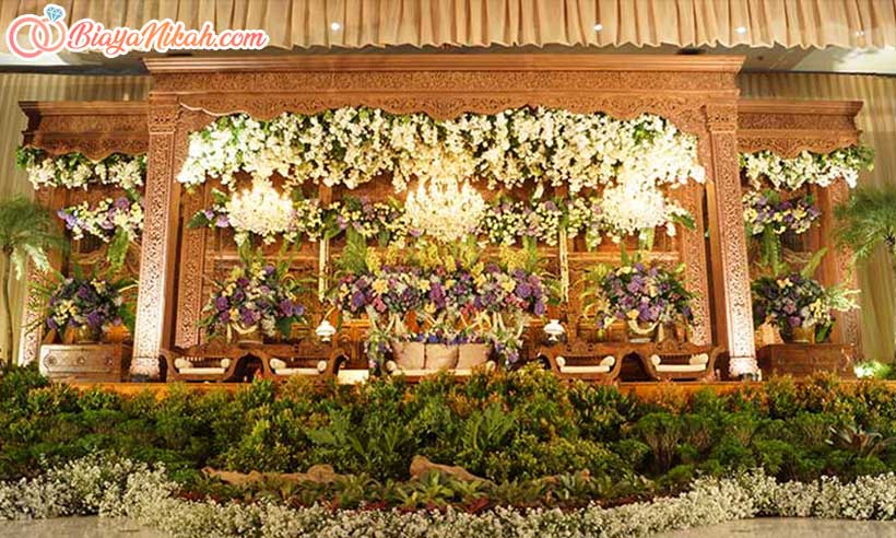 | Rp 30.000.000 | Dekorasi hingga 10 m, stan tamu, 6 standing flower, panggung mewah, pintu masuk love, kipas angin, set alat piring dan perabot, tata rias & busana pengantin, jasa fotografi. |