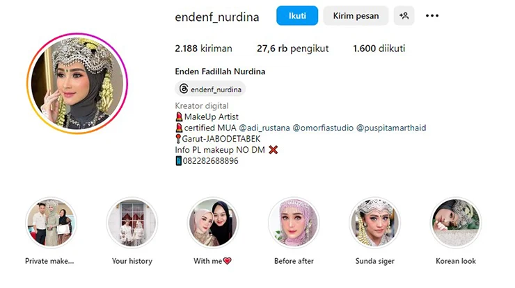 Rekomendasi lainnya yang bisa kamu pilih adalah Enden Fadillah Nurdina satu ini. Mereka cukup mahir dalam menghadirkan riasan bertema sunda siger kepada para kliennya.